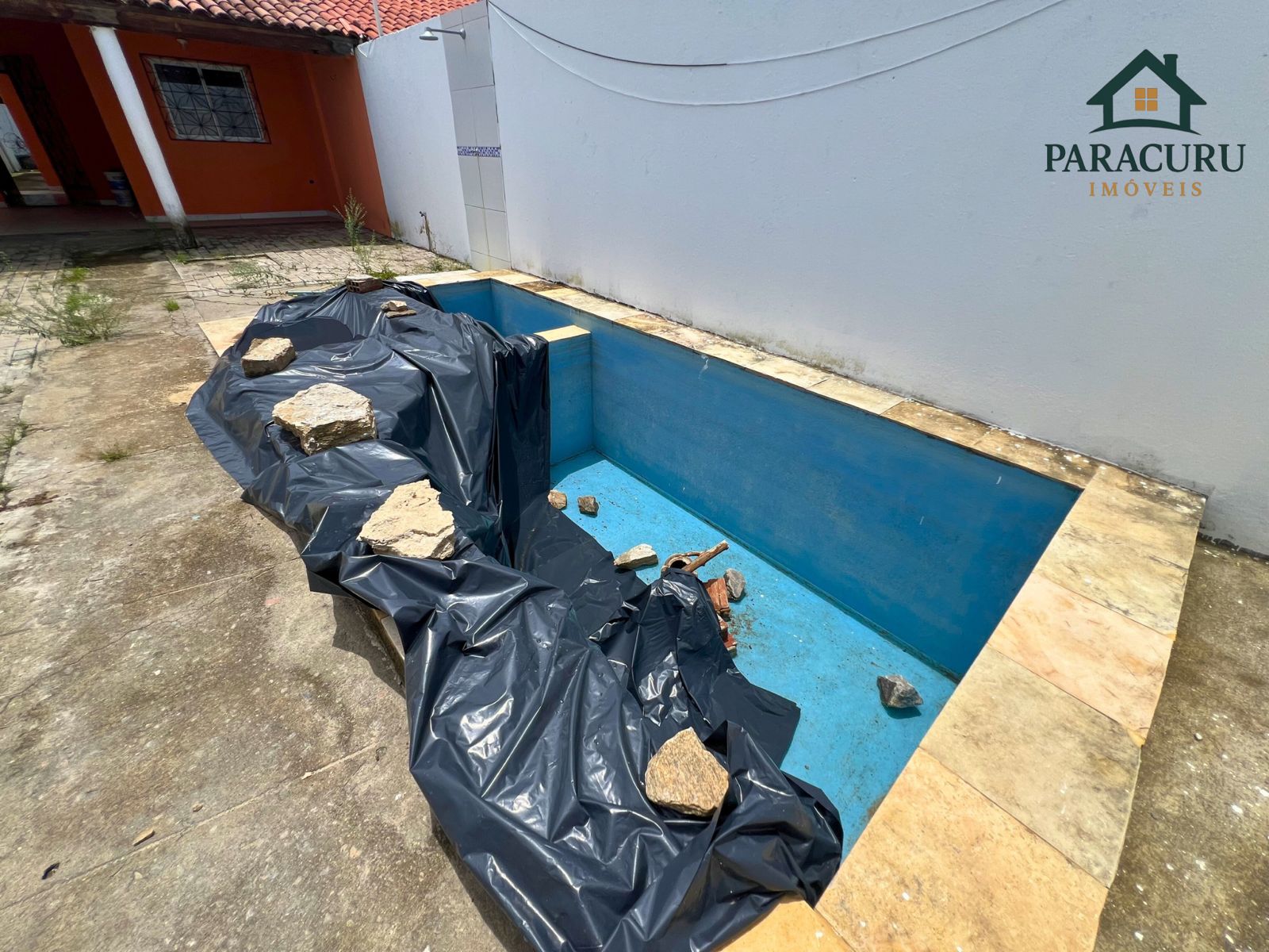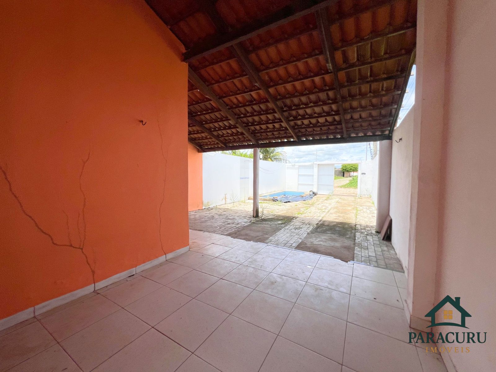 Garagem coberta e piscina.